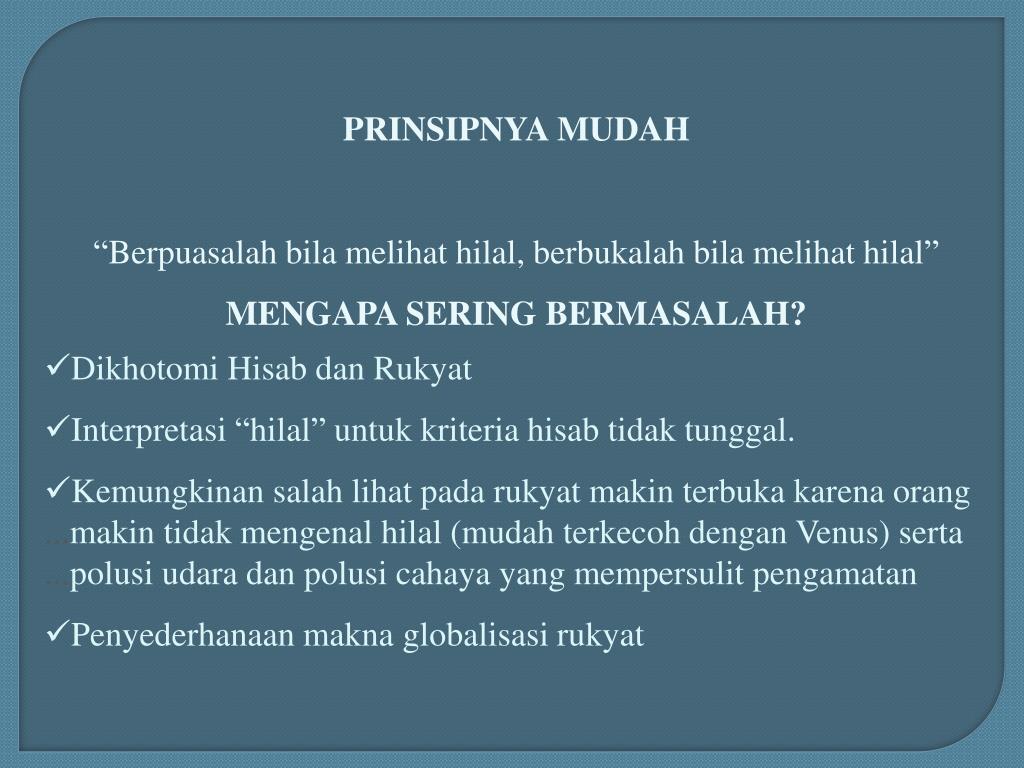 PRINSIPNYA MUDAH “Berpuasalahbilamelihathilal, berbukalahbilamelihathilal” MENGAPA SERING BERMASALAH? • DikhotomiHisabdanRukyat • Interpretasi “hilal” untukkriteriahisabtidaktunggal. • Kemungkinansalahlihatpadarukyatmakinterbukakarenaorang...makintidakmengenalhilal (mudahterkecohdengan Venus) serta...polusiudaradanpolusicahaya yang mempersulitpengamatan • Penyederhanaanmaknaglobalisasirukyat