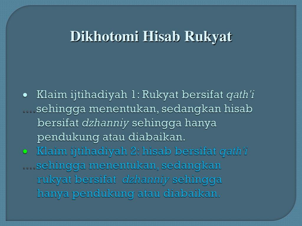 ·Klaimijtihadiyah 1: Rukyatbersifatqath'i....sehinggamenentukan, sedangkanhisabbersifatdzhanniysehinggahanyapendukungataudiabaikan.· Klaimijtihadiyah 2: hisabbersifatqath'i....sehinggamenentukan, sedangkanrukyatbersifatdzhanniysehinggahanyapendukungataudiabaikan. Dikhotomi Hisab Rukyat