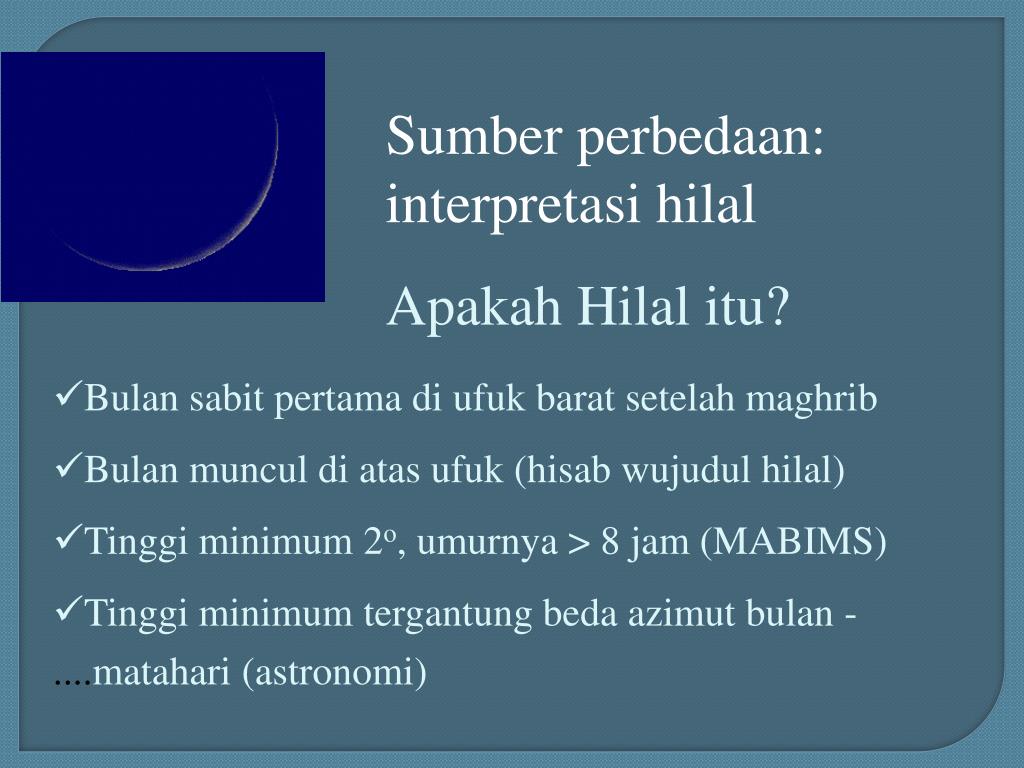 Sumber perbedaan: interpretasi hilal Apakah Hilal itu? • Bulan sabit pertama di ufuk barat setelah maghrib • Bulan muncul di atas ufuk (hisab wujudul hilal) • Tinggi minimum 2o, umurnya > 8 jam (MABIMS) • Tinggi minimum tergantung beda azimut bulan - ....matahari (astronomi)