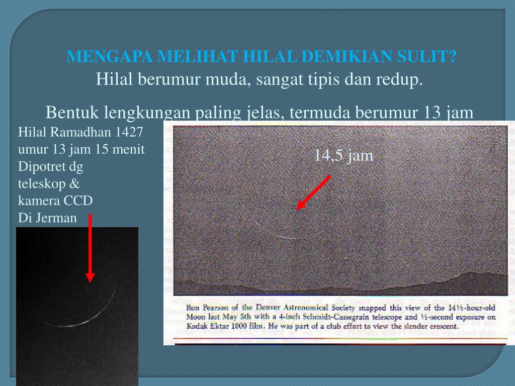 MENGAPA MELIHAT HILAL DEMIKIAN SULIT? Hilal berumur muda, sangat tipis dan redup. Bentuk lengkungan paling jelas, termuda berumur 13 jam Hilal Ramadhan 1427 umur 13 jam 15 menit Dipotret dg teleskop & kamera CCD Di Jerman 14,5 jam