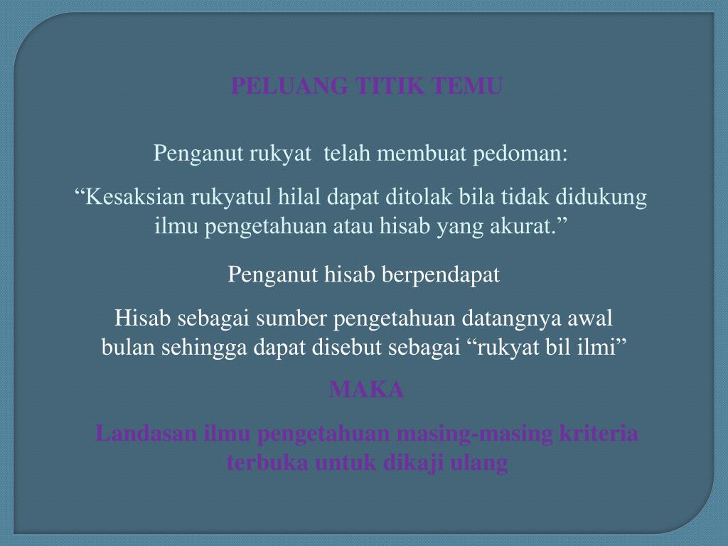 PELUANG TITIK TEMU Penganut rukyat telah membuat pedoman: “Kesaksian rukyatul hilal dapat ditolak bila tidak didukung ilmu pengetahuan atau hisab yang akurat.” Penganut hisab berpendapat Hisab sebagai sumber pengetahuan datangnya awal bulan sehingga dapat disebut sebagai “rukyat bil ilmi” MAKA Landasan ilmu pengetahuan masing-masing kriteria terbuka untuk dikaji ulang