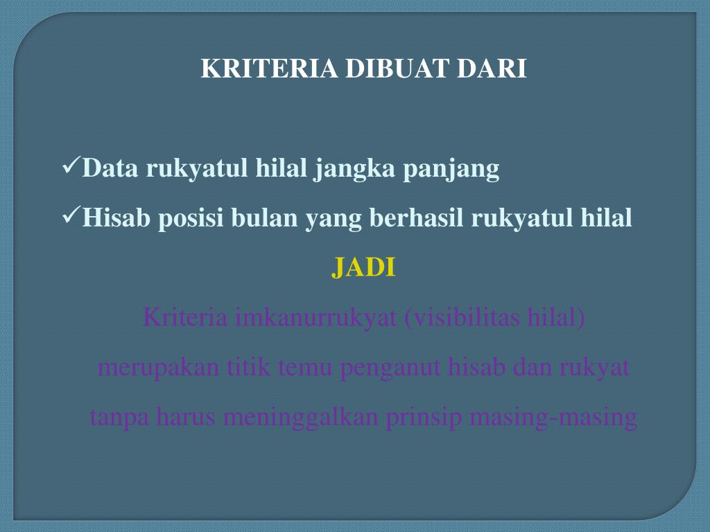 KRITERIA DIBUAT DARI • Data rukyatul hilal jangka panjang • Hisab posisi bulan yang berhasil rukyatul hilal JADI Kriteria imkanurrukyat (visibilitas hilal) merupakan titik temu penganut hisab dan rukyat tanpa harus meninggalkan prinsip masing-masing