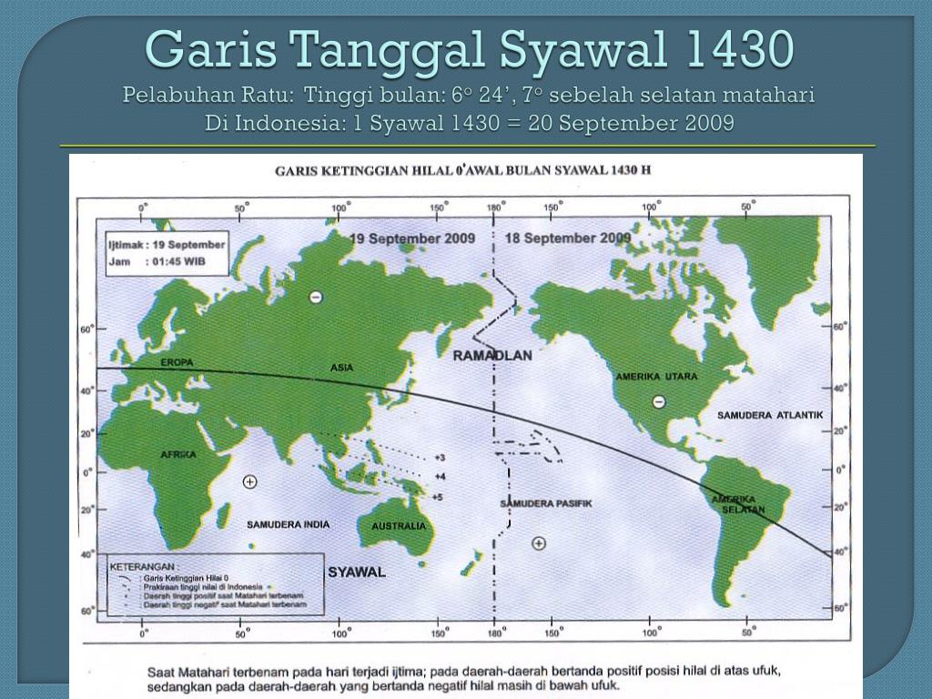 Garis Tanggal Syawal 1430Pelabuhan Ratu: Tinggi bulan: 6o 24’, 7o sebelah selatan matahariDi Indonesia: 1 Syawal 1430 = 20 September 2009