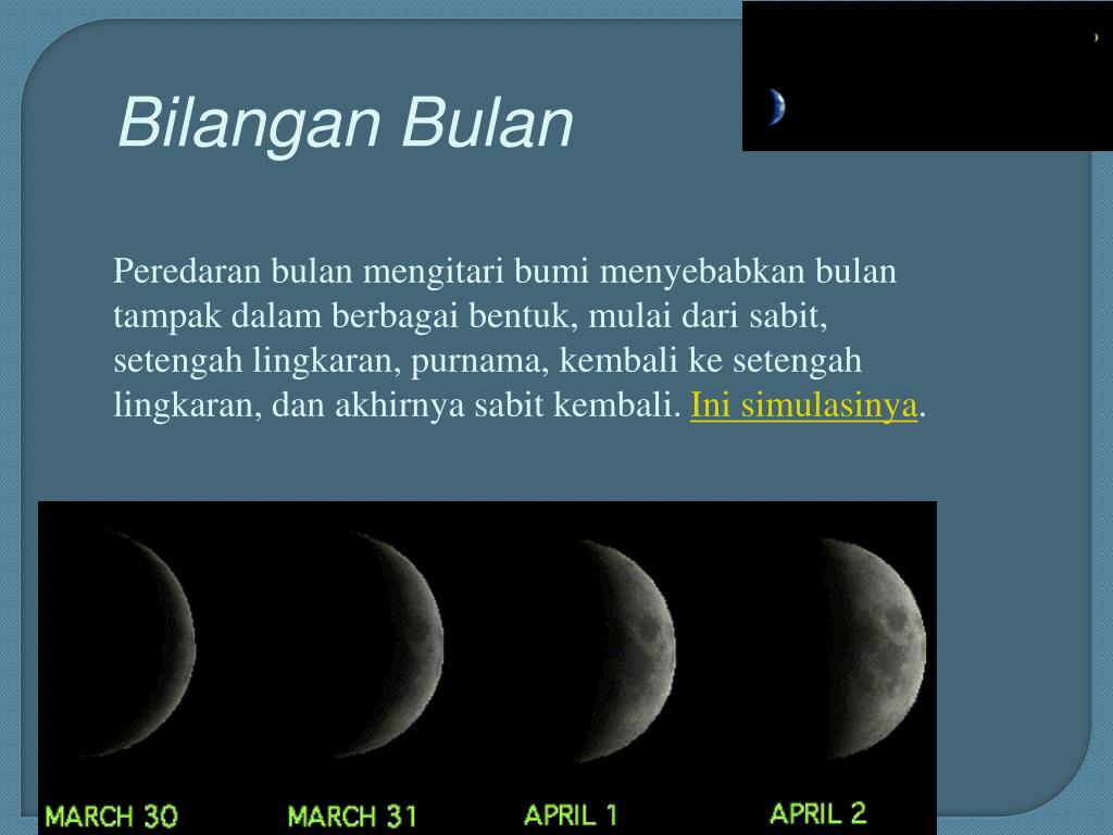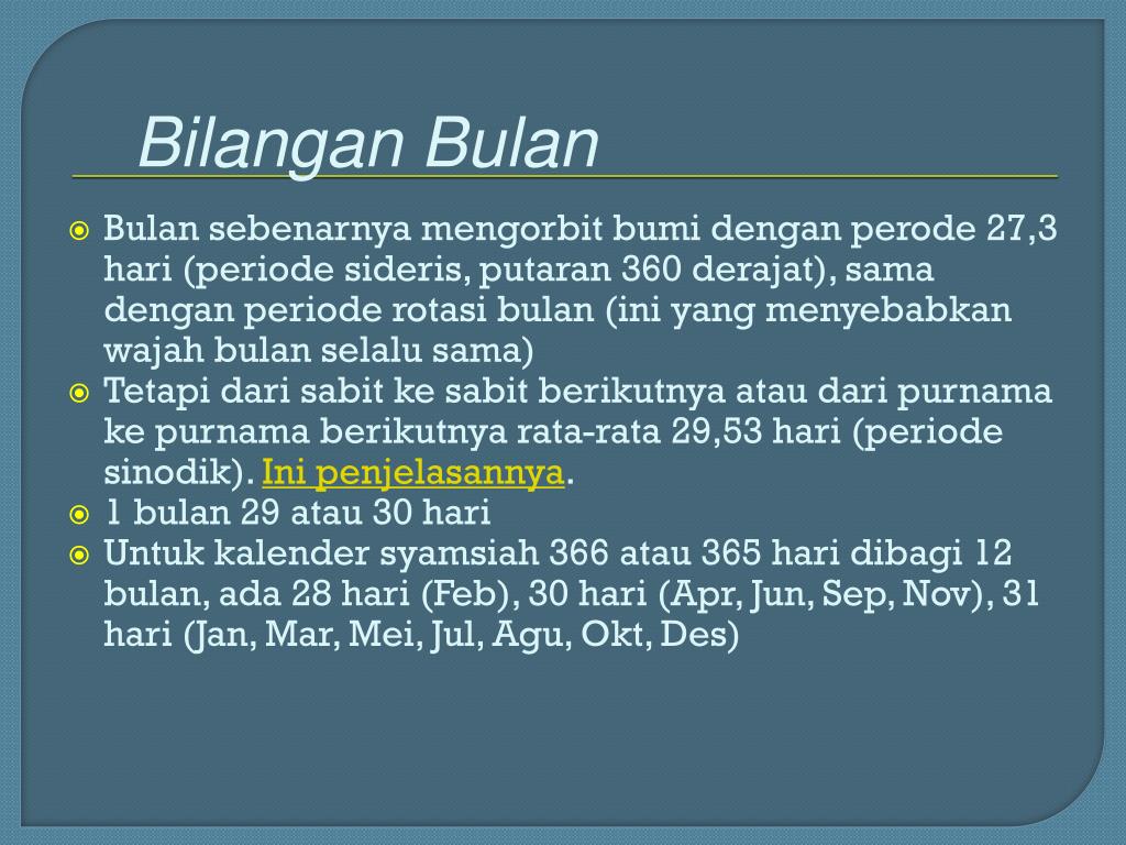 Bilangan Bulan Bulan sebenarnya mengorbit bumi dengan perode 27,3 hari (periode sideris, putaran 360 derajat), sama dengan periode rotasi bulan (ini yang menyebabkan wajah bulan selalu sama) Tetapi dari sabit ke sabit berikutnya atau dari purnama ke purnama berikutnya rata-rata 29,53 hari (periode sinodik). Ini penjelasannya. 1 bulan 29 atau 30 hari Untuk kalender syamsiah 366 atau 365 hari dibagi 12 bulan, ada 28 hari (Feb), 30 hari (Apr, Jun, Sep, Nov), 31 hari (Jan, Mar, Mei, Jul, Agu, Okt, Des)