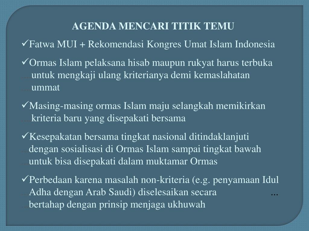 MenujuTitikTemuKriteriaBersama Rekomendasi Fatwa MUI Nomor 2/2004 Rekomendasi Agar Majelis Ulama Indonesia mengusahakan adanya kriteria penentuan awal. Ramadhan, Syawal, dan Dzulhijah untuk dijadikan pedoman oleh Menteri Agama dengan membahasnya bersama ormas-ormas Islam dan para ahli terkait.