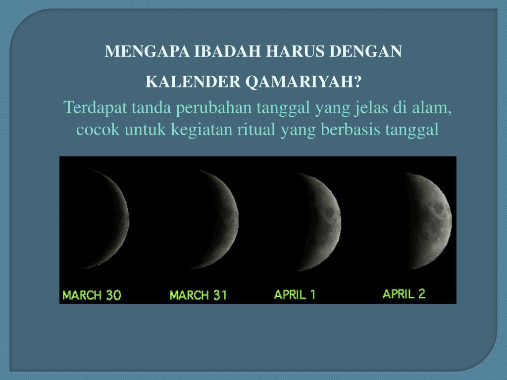 MENGAPA IBADAH HARUS DENGAN KALENDER QAMARIYAH? Terdapat tanda perubahan tanggal yang jelas di alam, cocok untuk kegiatan ritual yang berbasis tanggal