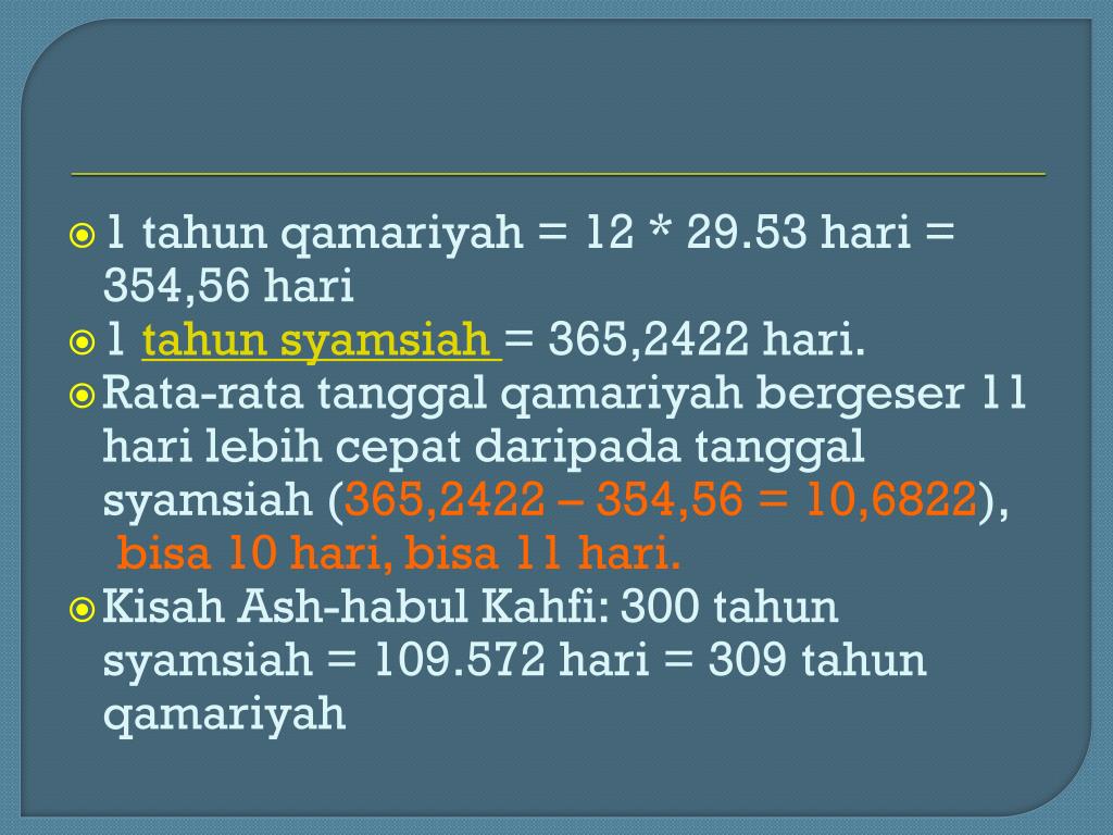 1 tahun qamariyah = 12 * 29.53 hari = 354,56 hari • 1 tahun syamsiah = 365,2422 hari. • Rata-rata tanggal qamariyah bergeser 11 hari lebih cepat daripada tanggal syamsiah (365,2422 – 354,56 = 10,6822), bisa 10 hari, bisa 11 hari. • Kisah Ash-habul Kahfi: 300 tahun syamsiah = 109.572 hari = 309 tahun qamariyah