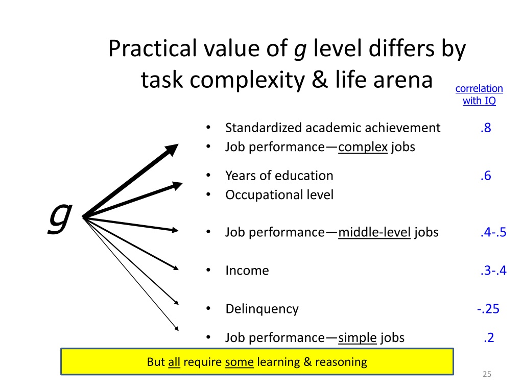 Practical value of g level differs by task complexity & life arena Standardized academic achievement .8 Job performance—complex jobs Years of education .6 Occupational level Job performance—middle-level jobs .4-.5 Income .3-.4 Delinquency -.25 Job performance—simple jobs .2 correlation with IQ g But all require some learning & reasoning