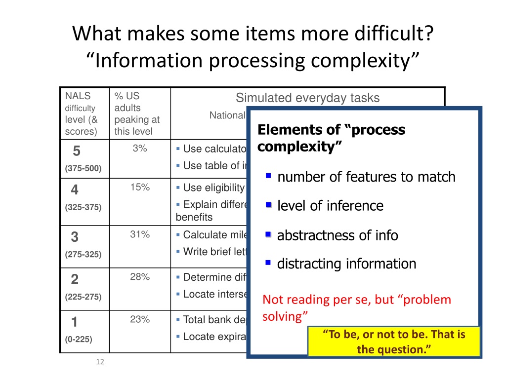 What makes some items more difficult?“Information processing complexity” Elements of “process complexity” • number of features to match • level of inference • abstractness of info • distracting information Not reading per se, but “problem solving” “To be, or not to be. That is the question.”
