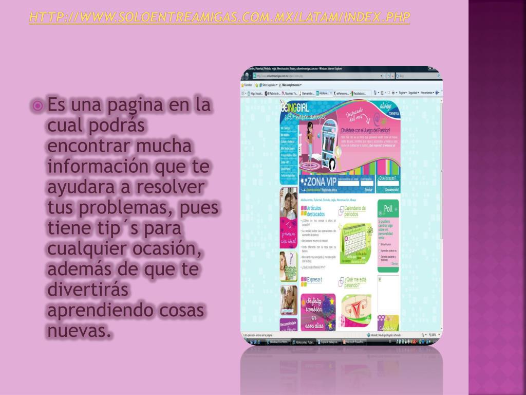 http://www.soloentreamigas.com.mx/latam/index.php • Es una pagina en la cual podrás encontrar mucha información que te ayudara a resolver tus problemas, pues tiene tip´s para cualquier ocasión, además de que te divertirás aprendiendo cosas nuevas.