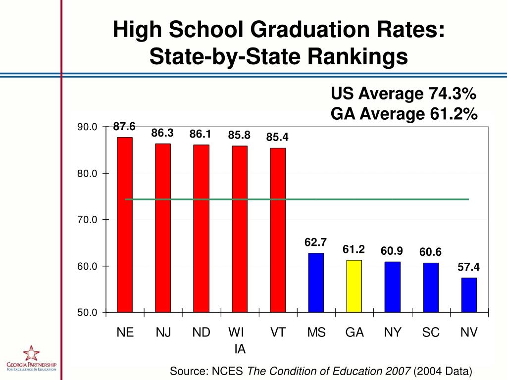 High School Graduation Rates: State-by-State Rankings US Average 74.3% GA Average 61.2% Source: NCES The Condition of Education 2007 (2004 Data)