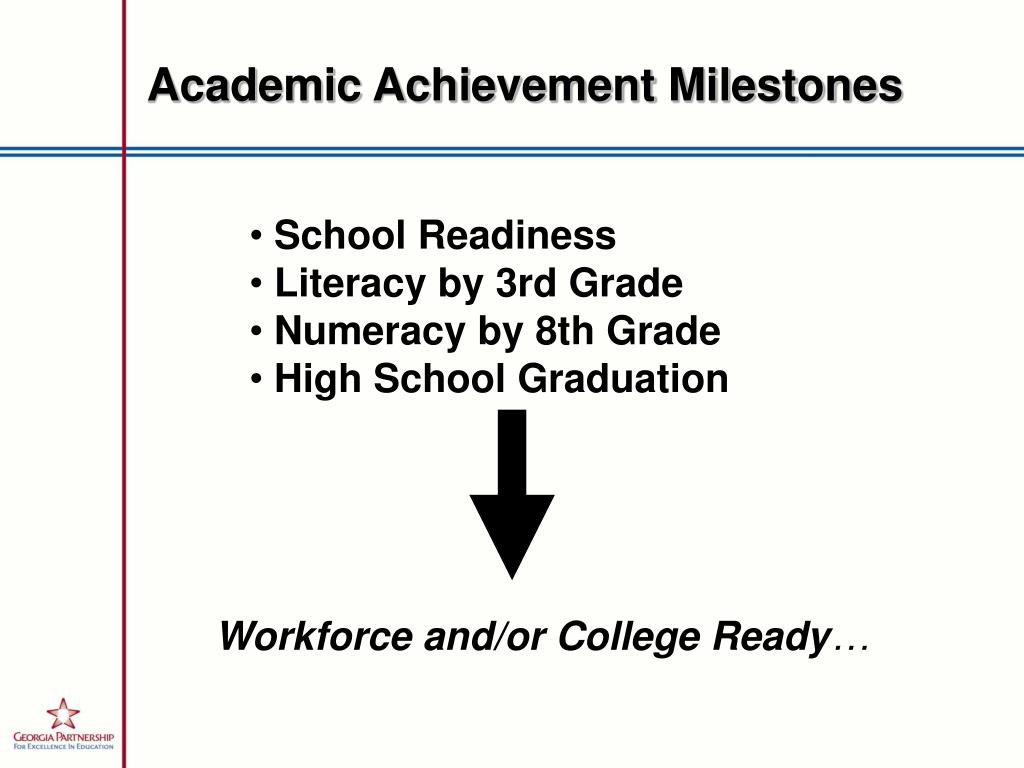 Academic Achievement Milestones • School Readiness • Literacy by 3rd Grade • Numeracy by 8th Grade • High School Graduation Workforce and/or College Ready…