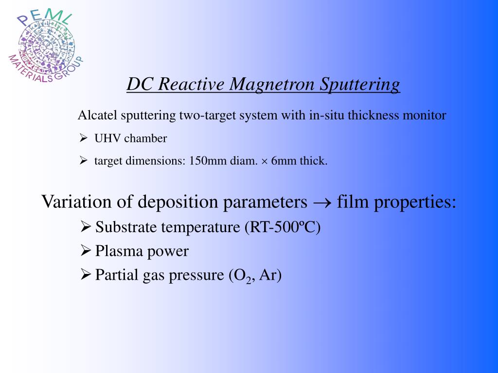 DC Reactive Magnetron Sputtering • Alcatel sputtering two-target system with in-situ thickness monitor • UHV chamber • target dimensions: 150mm diam. 6mm thick. Variation of deposition parameters film properties: • Substrate temperature (RT-500ºC) • Plasma power • Partial gas pressure (O2, Ar)