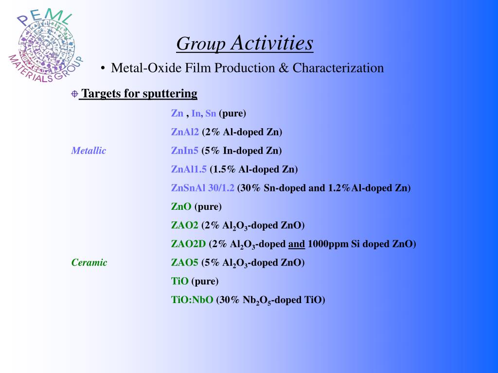 Group Activities • Metal-Oxide Film Production & Characterization • Targets for sputtering • Zn , In, Sn(pure) • ZnAl2 (2% Al-doped Zn) • MetallicZnIn5 (5% In-doped Zn) • ZnAl1.5 (1.5% Al-doped Zn) • ZnSnAl 30/1.2 (30% Sn-doped and 1.2%Al-doped Zn) • ZnO (pure) • ZAO2 (2% Al2Ο3-doped ZnO) • ZAO2D (2% Al2Ο3-doped and 1000ppm Si doped ZnO) • Ceramic ZAO5 (5% Al2Ο3-doped ZnO) • TiO (pure) • TiO:NbO (30% Nb2O5-doped TiO)