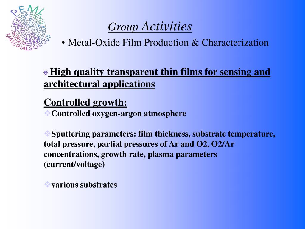 Group Activities • Metal-Oxide Film Production & Characterization • High quality transparent thin films for sensing and architectural applications • Controlled growth: • Controlled oxygen-argon atmosphere • Sputtering parameters: film thickness, substrate temperature, total pressure, partial pressures of Ar and O2, O2/Ar concentrations, growth rate, plasma parameters (current/voltage) • various substrates