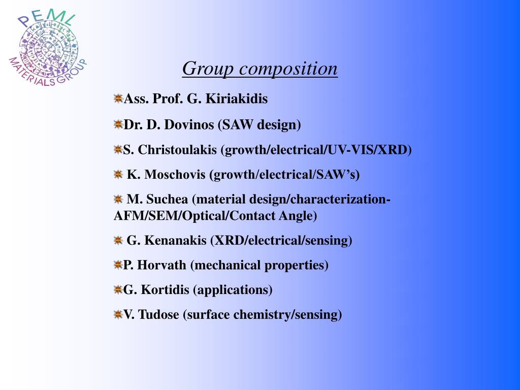 Group composition • Ass. Prof.G. Kiriakidis • Dr. D. Dovinos (SAW design) • S. Christoulakis (growth/electrical/UV-VIS/XRD) • K. Moschovis (growth/electrical/SAW’s) • M. Suchea (material design/characterization- AFM/SEM/Optical/Contact Angle) • G. Kenanakis (XRD/electrical/sensing) • P. Horvath (mechanical properties) • G. Kortidis (applications) • V. Tudose (surface chemistry/sensing)