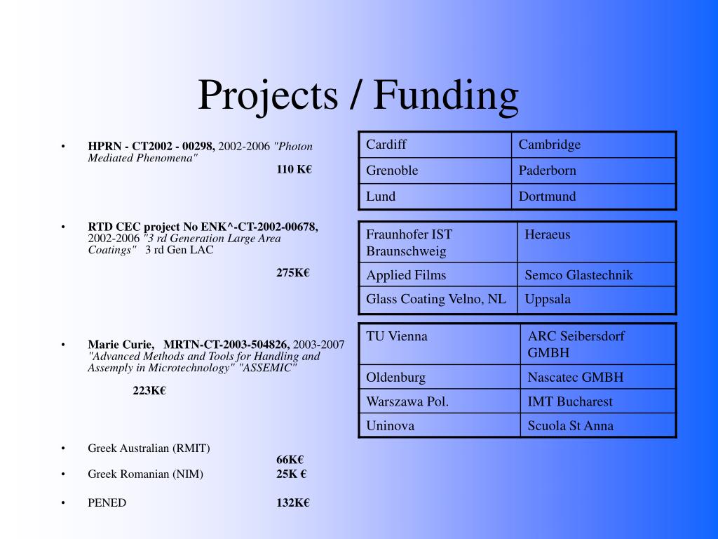 Projects / Funding • HPRN - CT2002 - 00298, 2002-2006 "Photon Mediated Phenomena" 110 K€ • RTD CEC project No ENK^-CT-2002-00678, 2002-2006 "3 rd Generation Large Area Coatings" 3 rd Gen LAC 275K€ • Marie Curie, MRTN-CT-2003-504826, 2003-2007 "Advanced Methods and Tools for Handling and Assemply in Microtechnology" "ASSEMIC" 223K€ • Greek Australian (RMIT) 66K€ • Greek Romanian (NIM) 25K € • PENED 132K€