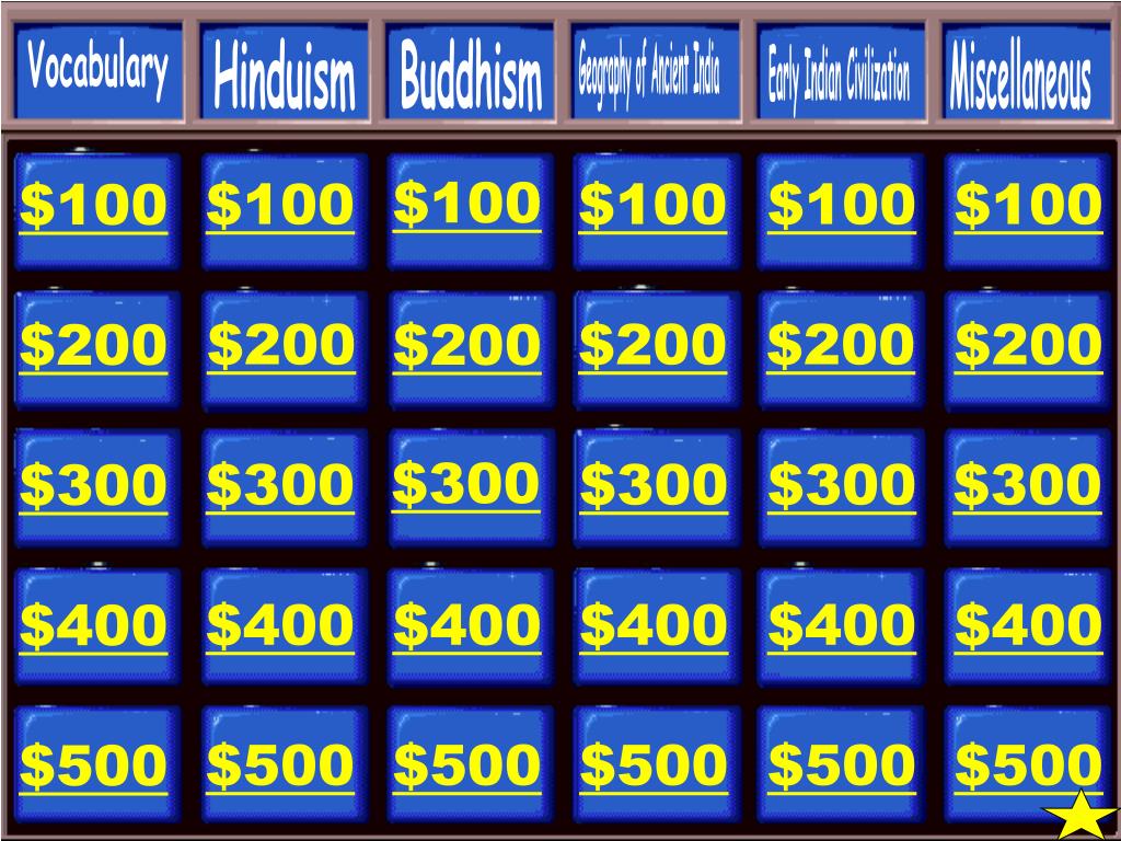 This. IS. Jeopardy. Vocabulary Words. Hinduism. Buddhism. Geography of Ancient India. Early Indian Civilization. Miscellaneous. Miscellaneous. Vocabulary. Hinduism. Buddhism. Geography of Ancient India. Early Indian Civilization. $100. $100. $100. $100. $ 100. $100. $200.