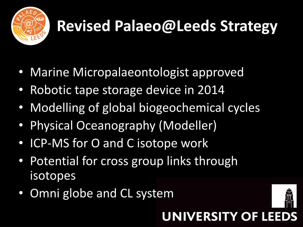 Revised Palaeo@Leeds Strategy • Marine Micropalaeontologist approved • Robotic tape storage device in 2014 • Modelling of global biogeochemical cycles • Physical Oceanography (Modeller) • ICP-MS for O and C isotope work • Potential for cross group links through isotopes • Omni globe and CL system