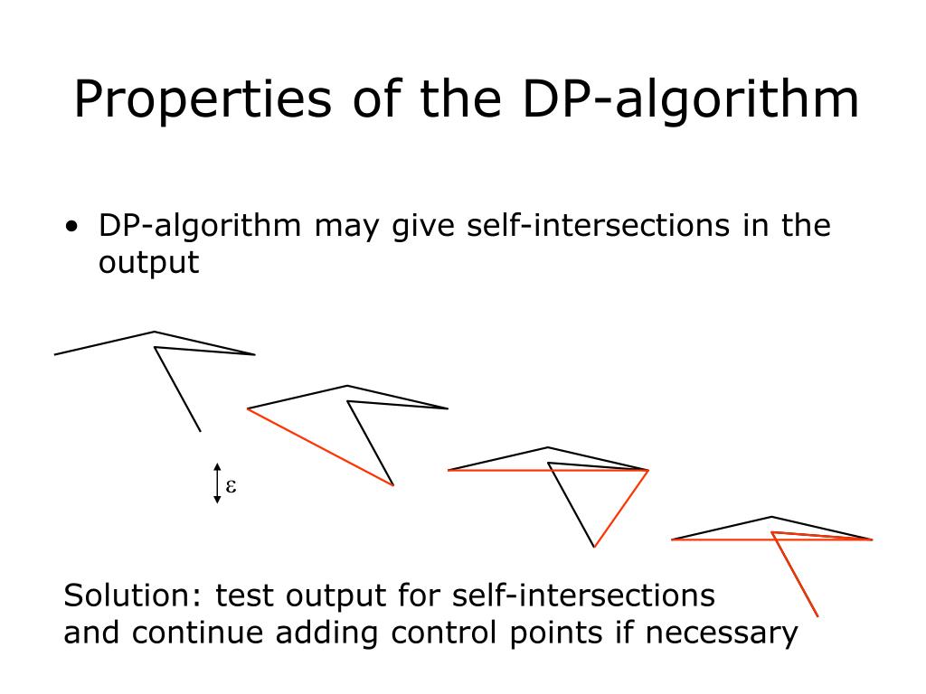 Properties of the DP-algorithm • DP-algorithm may giveself-intersections in the output Solution: test output forself-intersectionsand continue adding controlpoints if necessary