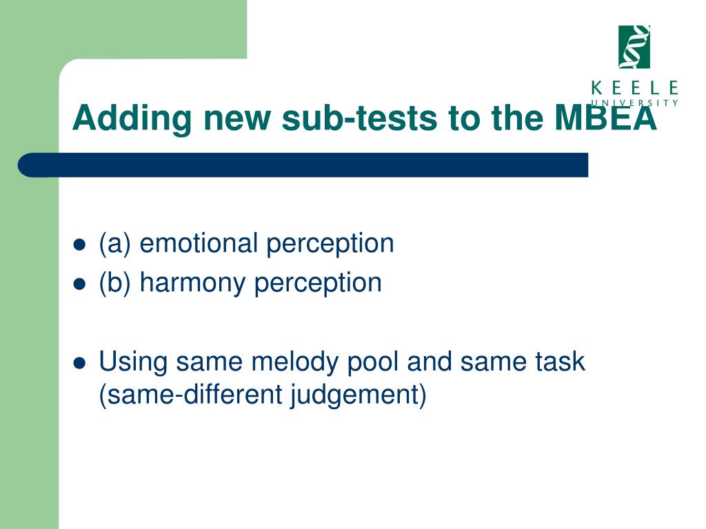 Adding new sub-tests to the MBEA • (a) emotional perception • (b) harmony perception • Using same melody pool and same task (same-different judgement)