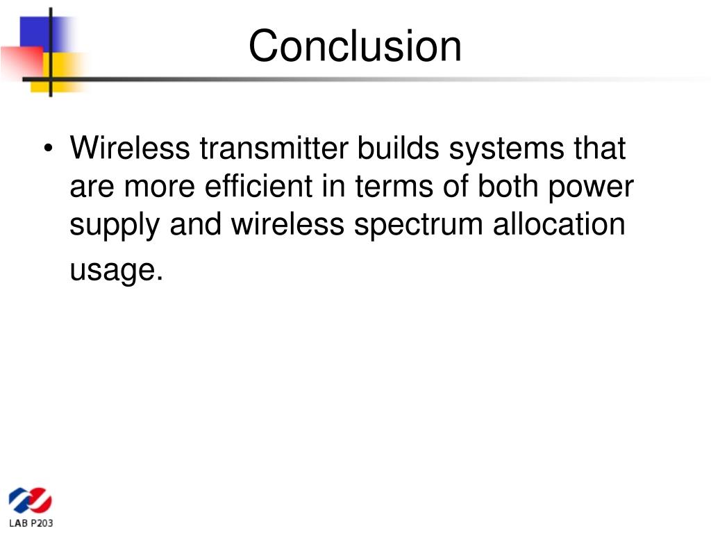 Conclusion • Wireless transmitter builds systems that are more efficient in terms of both power supply and wireless spectrum allocation usage.