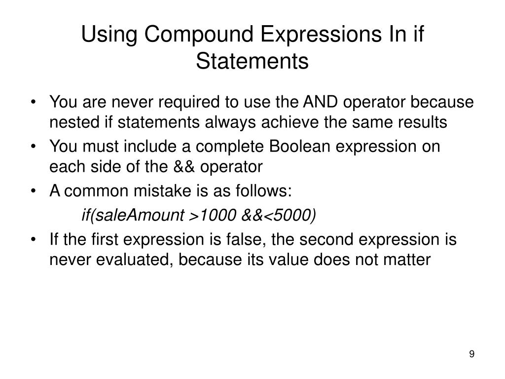Using Compound Expressions In if Statements • You are never required to use the AND operator because nested if statements always achieve the same results • You must include a complete Boolean expression on each side of the && operator • A common mistake is as follows: if(saleAmount >1000 &&<5000) • If the first expression is false, the second expression is never evaluated, because its value does not matter