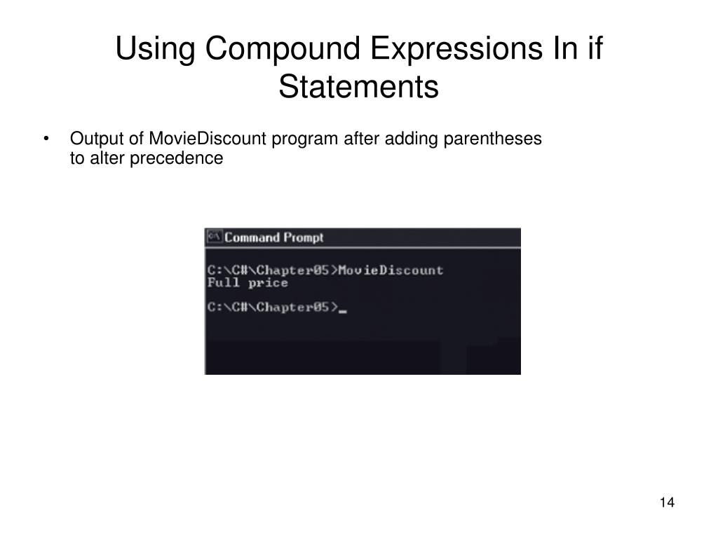 Using Compound Expressions In if Statements • Output of MovieDiscount program before adding parentheses to alter precedence