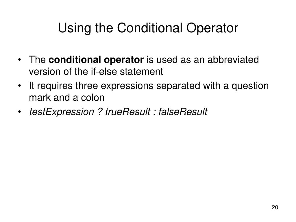 Using the Conditional Operator • The conditional operator is used as an abbreviated version of the if-else statement • It requires three expressions separated with a question mark and a colon • testExpression ? trueResult : falseResult