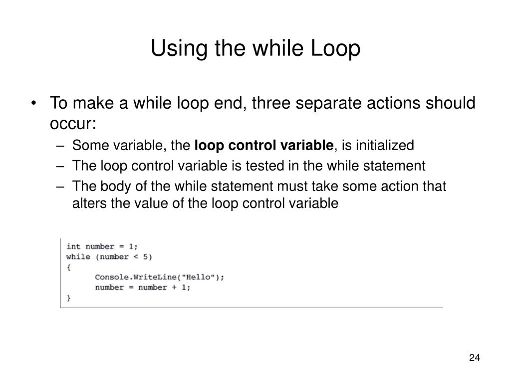 Using the while Loop • A loop is a structure that allows repeated execution of a block of statements • Within a looping structure, a Boolean expression is evaluated. If it is true, a block of statements called the loop body executes, and then the Boolean expression is evaluated again. • As long as the expression is true, the statements in the loop body continue to execute