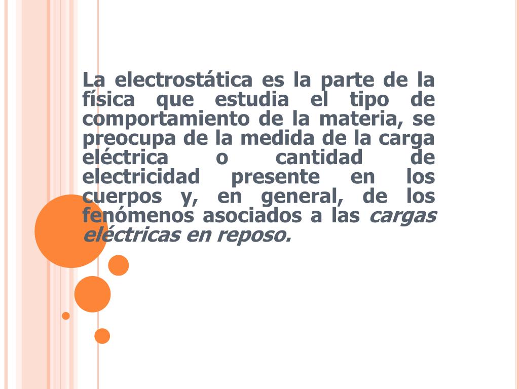Laelectrostáticaes la parte de la física que estudia el tipo de comportamiento de la materia, se preocupa de la medida de la carga eléctrica o cantidad de electricidad presente en los cuerpos y, en general, de los fenómenos asociados a las cargas eléctricas en reposo.