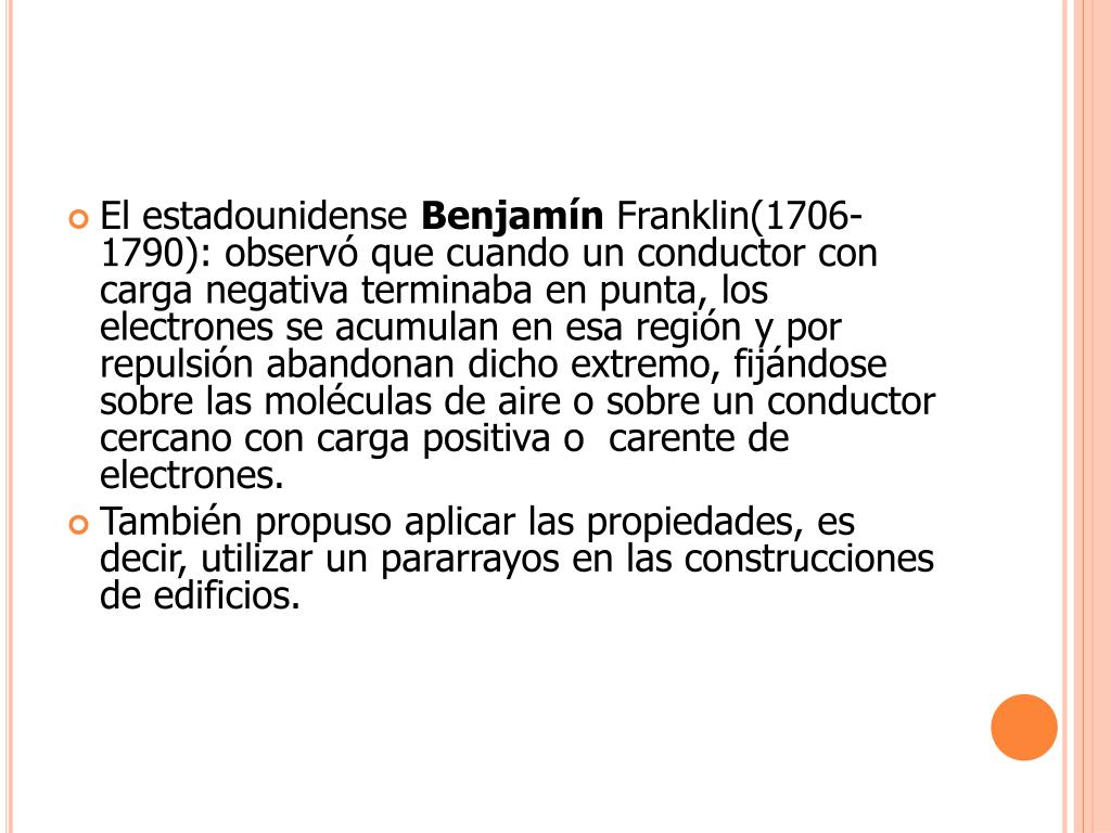El estadounidense Benjamín Franklin(1706-1790): observó que cuando un conductor con carga negativa terminaba en punta, los electrones se acumulan en esa región y por repulsión abandonan dicho extremo, fijándose sobre las moléculas de aire o sobre un conductor cercano con carga positiva o carente de electrones. • También propuso aplicar las propiedades, es decir, utilizar un pararrayos en las construcciones de edificios.