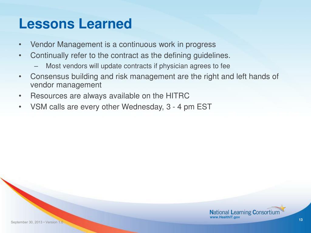 Lessons Learned • Vendor Management is a continuous work in progress • Continually refer to the contract as the defining guidelines. • Most vendors will update contracts if physician agrees to fee • Consensus building and risk management are the right and left hands of vendor management • Resources are always available on the HITRC • VSM calls are every other Wednesday, 3 - 4 pm EST September 30, 2013 • Version 1.0