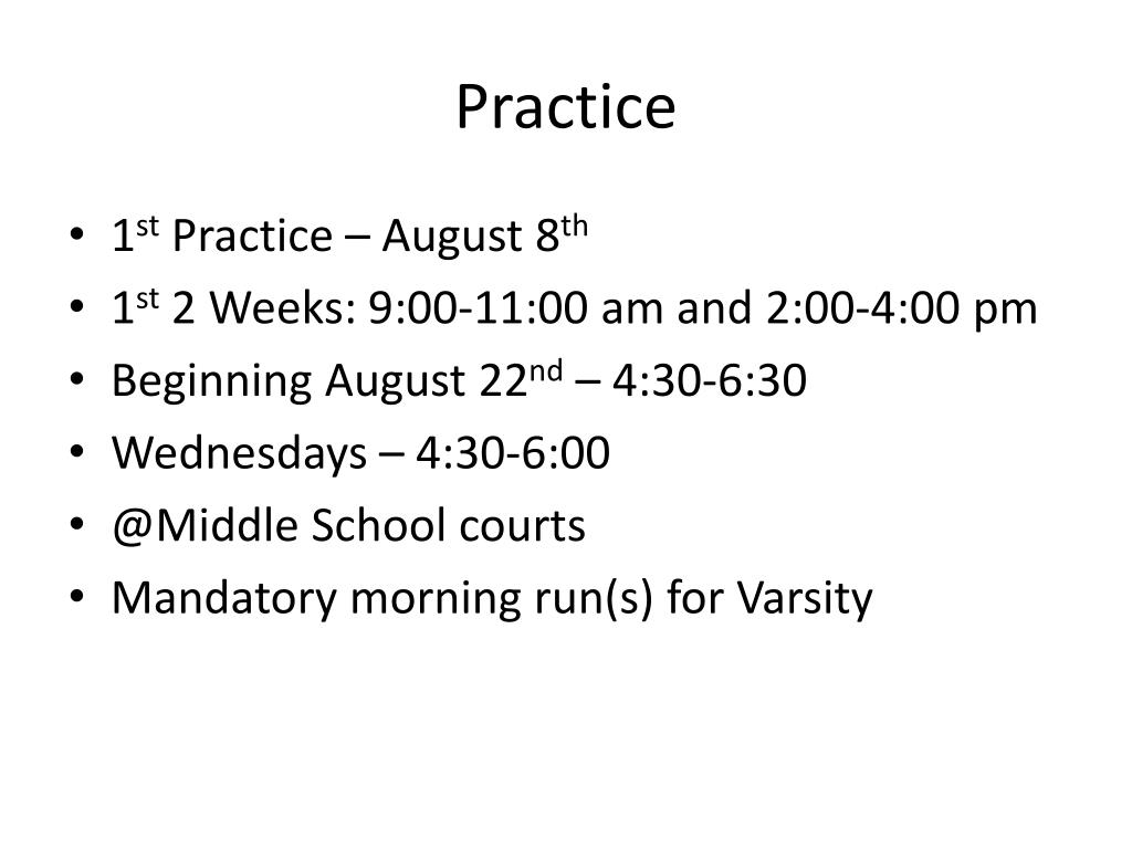 Practice • 1st Practice – August 8th • 1st 2 Weeks: 9:00-11:00 am and 2:00-4:00 pm • Beginning August 22nd – 4:30-6:30 • Wednesdays – 4:30-6:00 • @Middle School courts • Mandatory morning run(s) for Varsity