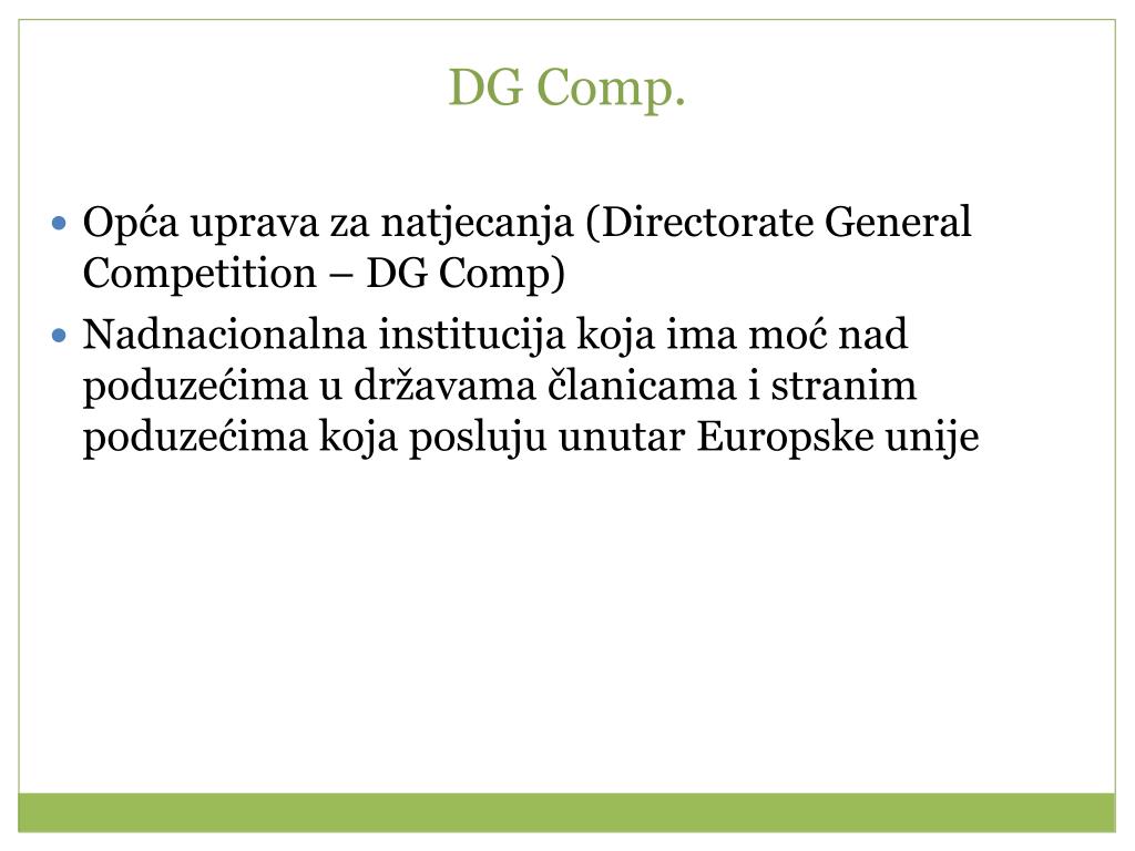 DG Comp. Opća uprava za natjecanja (Directorate General Competition – DG Comp) Nadnacionalna institucija koja ima moć nad poduzećima u državama članicama i stranim poduzećima koja posluju unutar Europske unije