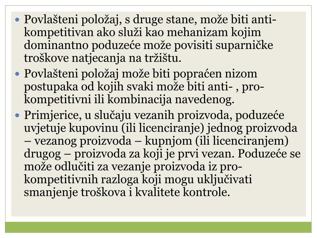 Povlašteni položaj, s druge stane, može biti anti-kompetitivan ako služi kao mehanizam kojim dominantno poduzeće može povisiti suparničke troškove natjecanja na tržištu. • Povlašteni položaj može biti popraćen nizom postupaka od kojih svaki može biti anti- , pro-kompetitivni ili kombinacija navedenog. • Primjerice, u slučaju vezanih proizvoda, poduzeće uvjetuje kupovinu (ili licenciranje) jednog proizvoda – vezanog proizvoda – kupnjom (ili licenciranjem) drugog – proizvoda za koji je prvi vezan. Poduzeće se može odlučiti za vezanje proizvoda iz pro-kompetitivnih razloga koji mogu uključivati smanjenje troškova i kvalitete kontrole.