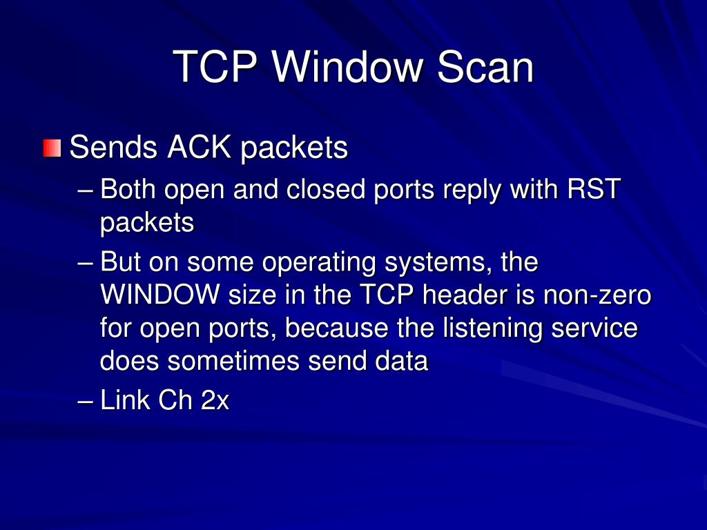 TCP Window Scan • Sends ACK packets • Both open and closed ports reply with RST packets • But on some operating systems, the WINDOW size in the TCP header is non-zero for open ports, because the listening service does sometimes send data • Link Ch 2x