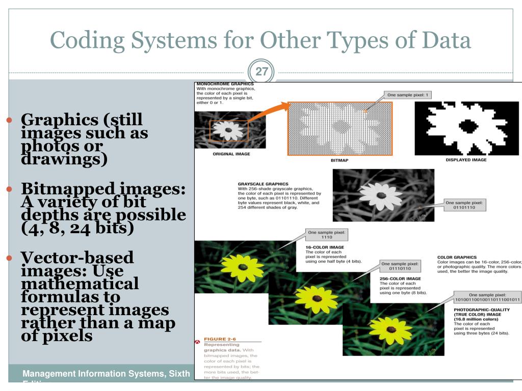 Coding Systems for Other Types of Data • Graphics (still images such as photos or drawings) • Bitmapped images: A variety of bit depths are possible (4, 8, 24 bits) • Vector-based images: Use mathematical formulas to represent images rather than a map of pixels Management Information Systems, Sixth Edition 27