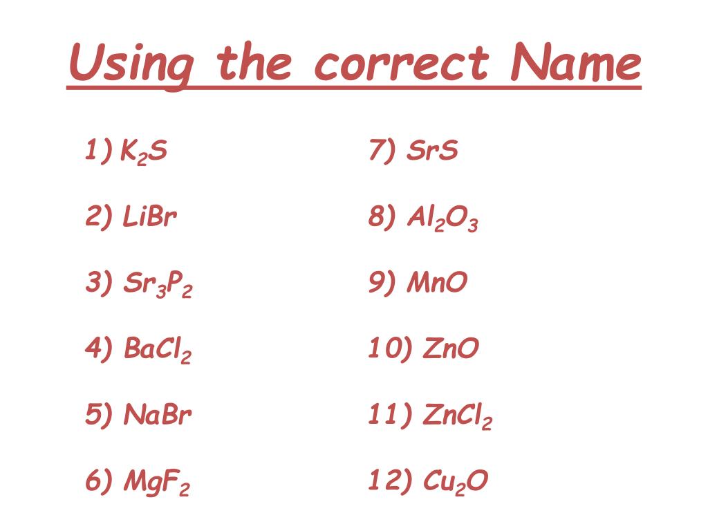 Using the correct Name • K2S 7) SrS • 2) LiBr 8) Al2O3 • 3) Sr3P2 9) MnO • 4) BaCl2 10) ZnO • 5) NaBr 11) ZnCl2 • 6) MgF2 12) Cu2O