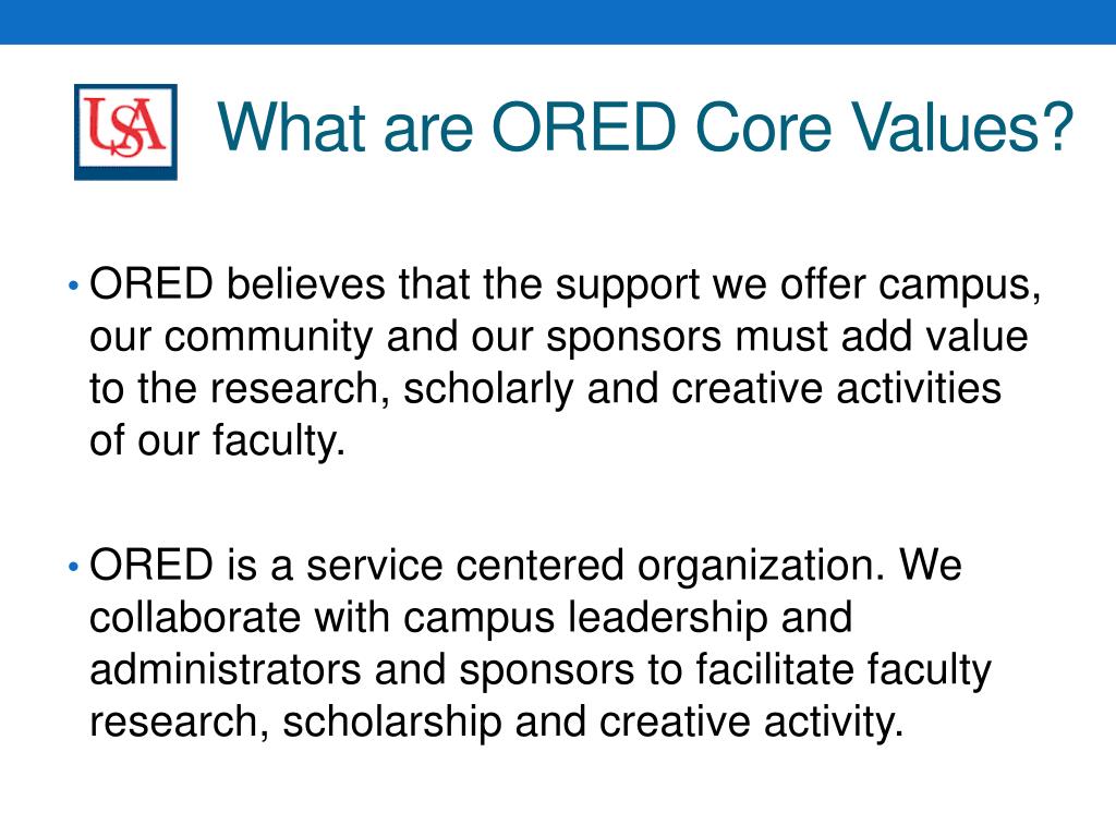 What are ORED Core Values? • ORED believes that the support we offer campus, our community and our sponsors must add value to the research, scholarly and creative activities of our faculty. • ORED is a service centered organization. We collaborate with campus leadership and administrators and sponsors to facilitate faculty research, scholarship and creative activity.