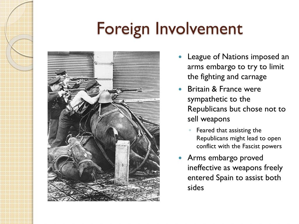 Foreign Involvement • League of Nations imposed an arms embargo to try to limit the fighting and carnage • Britain & France were sympathetic to the Republicans but chose not to sell weapons • Feared that assisting the Republicans might lead to open conflict with the Fascist powers • Arms embargo proved ineffective as weapons freely entered Spain to assist both sides