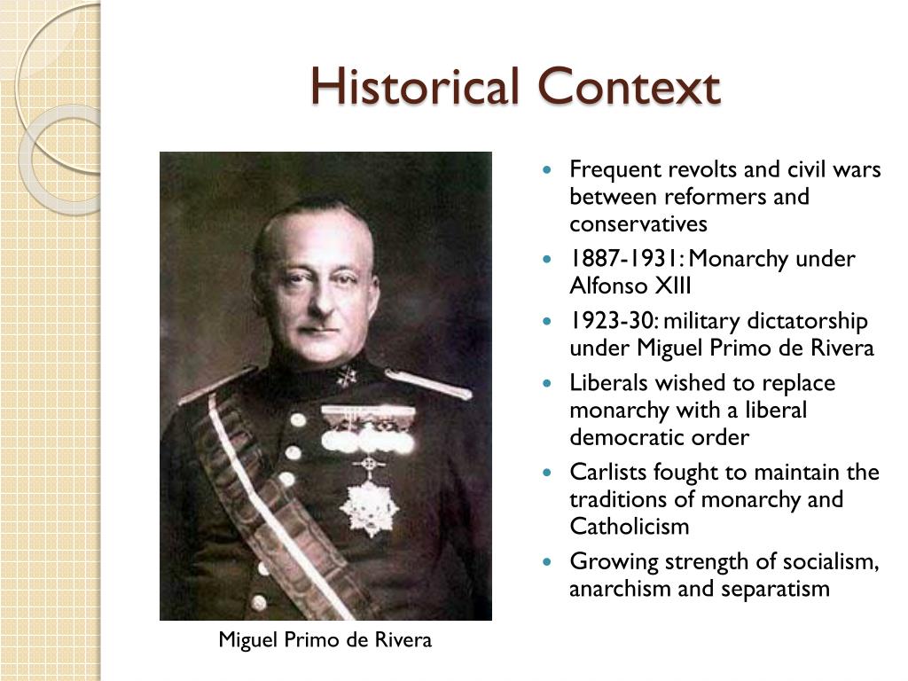 Historical Context • Frequent revolts and civil wars between reformers and conservatives • 1887-1931: Monarchy under Alfonso XIII • 1923-30: military dictatorship under Miguel Primo de Rivera • Liberals wished to replace monarchy with a liberal democratic order • Carlists fought to maintain the traditions of monarchy and Catholicism • Growing strength of socialism, anarchism and separatism Miguel Primo de Rivera