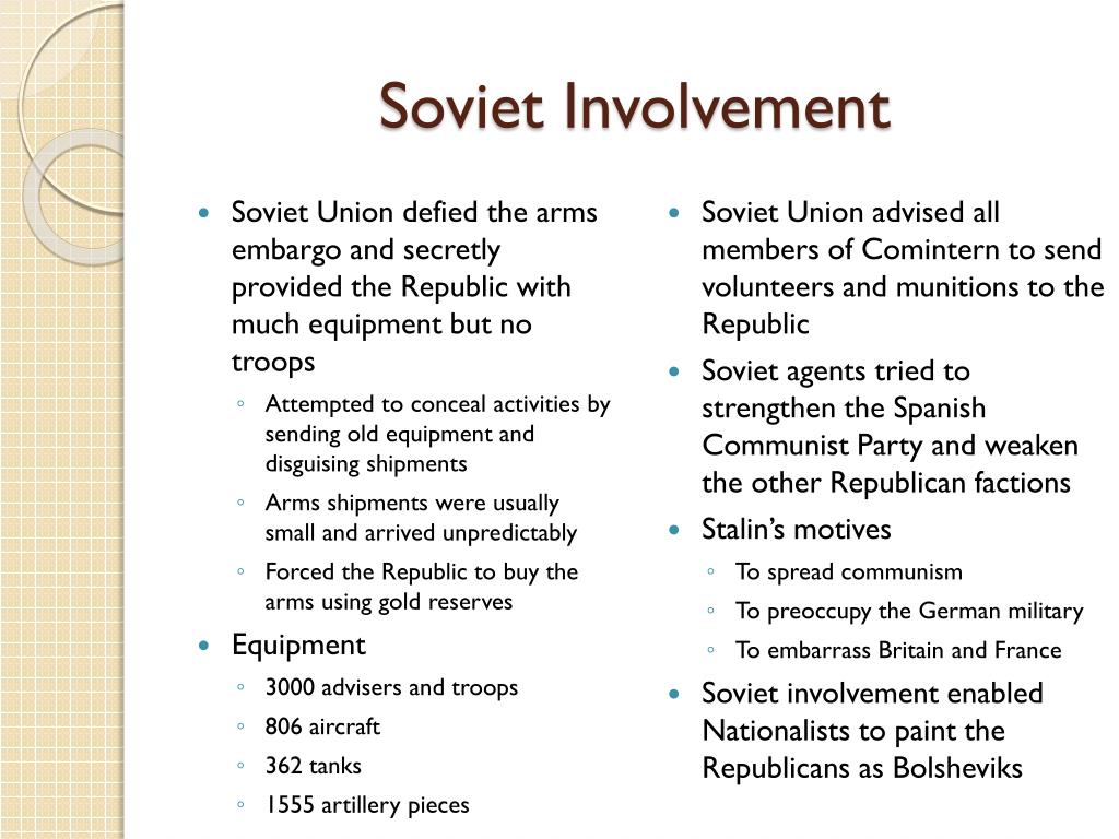 Soviet Involvement • Soviet Union defied the arms embargo and secretly provided the Republic with much equipment but no troops • Attempted to conceal activities by sending old equipment and disguising shipments • Arms shipments were usually small and arrived unpredictably • Forced the Republic to buy the arms using gold reserves • Equipment • 3000 advisers and troops • 806 aircraft • 362 tanks • 1555 artillery pieces • Soviet Union advised all members of Comintern to send volunteers and munitions to the Republic • Soviet agents tried to strengthen the Spanish Communist Party and weaken the other Republican factions • Stalin’s motives • To spread communism • To preoccupy the German military • To embarrass Britain and France • Soviet involvement enabled Nationalists to paint the Republicans as Bolsheviks