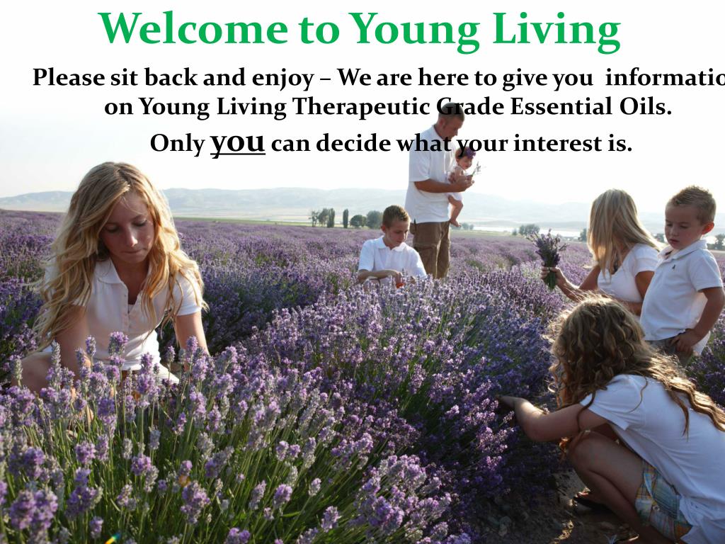 Welcome to Young Living Please sit back and enjoy – We are here to give you information on Young Living Therapeutic Grade Essential Oils. Only you can decide what your interest is.