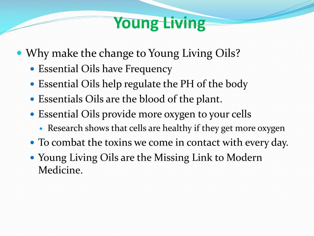 Young Living • Why make the change to Young Living Oils? • Essential Oils have Frequency • Essential Oils help regulate the PH of the body • Essentials Oils are the blood of the plant. • Essential Oils provide more oxygen to your cells • Research shows that cells are healthy if they get more oxygen • To combat the toxins we come in contact with every day. • Young Living Oils are the Missing Link to Modern Medicine.