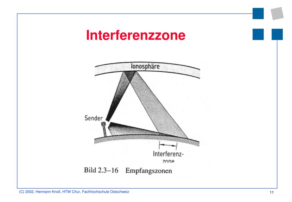 Kurzwellen (KW) • Reflexion der Raumwelle an der Ionosphäre • Mehrfachreflexionen -> ausgeprägter Fernempfang • Oft grosse tote Zonen • Übertragungsqualität von Tageszeit, Jahreszeit, Sonnenfleckenzahl abhängig