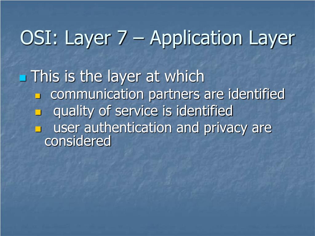 OSI: Layer 7 – Application Layer • This is the layer at which • communication partners are identified • quality of service is identified • user authentication and privacy are considered