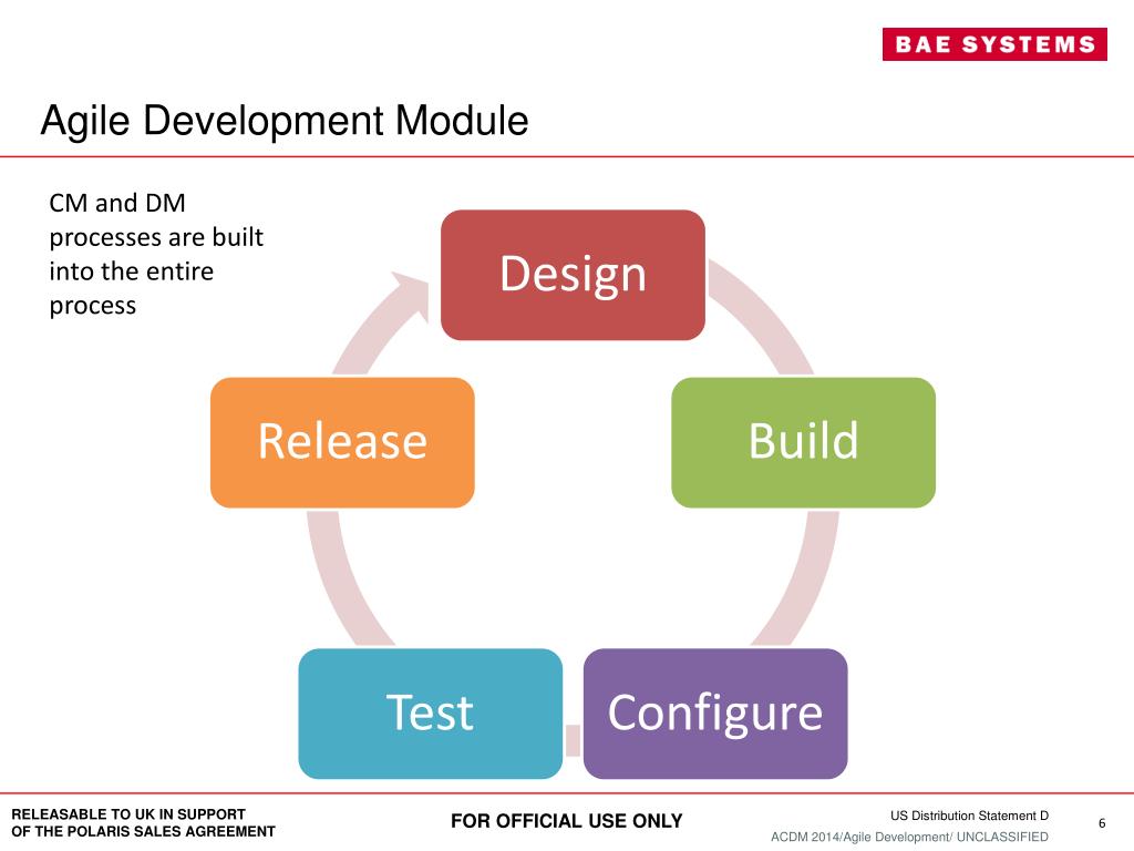 Why Agile Development? • BAE Systems, along with our government customer,has been producing software in agile development • Due to government budget cuts, contractors needed to find a way to decrease cost maintaininga high level of CM/DM for their products • Agile Development, unlike traditional development, allows more flexibility during the entire software development process • Agile Development allows more frequent software releases to the customer • Agile Development allows more participation bythe development team and the customer