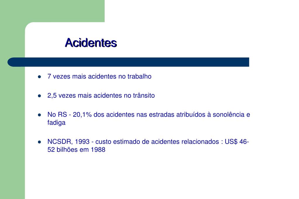 Acidentes • 7 vezes mais acidentes no trabalho • 2,5 vezes mais acidentes no trânsito • No RS - 20,1% dos acidentes nas estradas atribuídos à sonolência e fadiga • NCSDR, 1993 - custo estimado de acidentes relacionados : US$ 46-52 bilhões em 1988