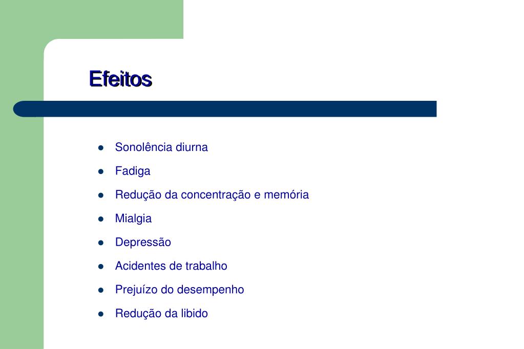 Efeitos • Sonolência diurna • Fadiga • Redução da concentração e memória • Mialgia • Depressão • Acidentes de trabalho • Prejuízo do desempenho • Redução da libido
